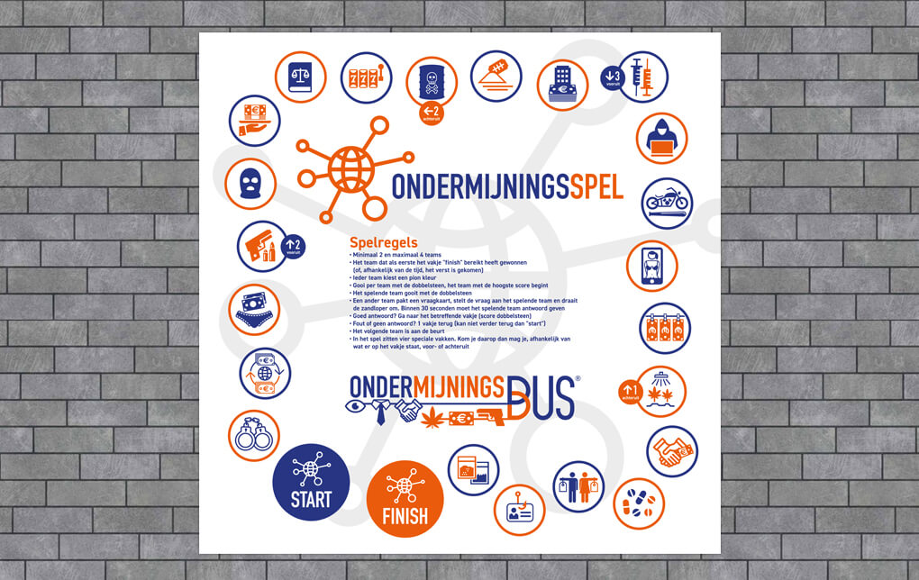 De eerste stap in de aanpak van ondermijning is bewustwording. Hoe meer professionals en burgers kennis hebben over georganiseerde criminaliteit, des te effectiever de bestrijding kan zijn! Hoe leuk is het om op een spelende en competitieve manier meer te weten te komen over ondermijnende criminaliteit? Met het Ondermijningsspel kom je spelenderwijs in aanraking met alle facetten van ondermijning. Het spel bestaat uit een groot speelkleed van 2 x 2 meter, met grote pionnen, een dobbelsteen, zandloper én vragen. Het is het ideale instrument voor een bewustwordingssessie van ongeveer anderhalf uur, waarbij ondermijning op een interactieve en competitieve manier in teamverband wordt ontdekt.